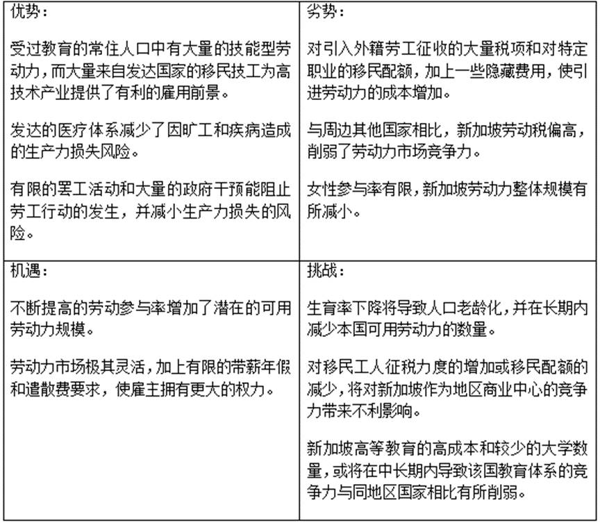 新加坡劳动力市场竞争力较高,优势明显。例如:人口城市化水平高、劳动力市场机制灵活、教育体系世界领先,由此培养出具有高度生产力和多样化技能的劳动力。外国投资者在新加坡劳动力市场面临的风险较为有限,主要包括:常住人口老龄化、工资上涨,以及有关引入外籍劳工的法规日趋严格。