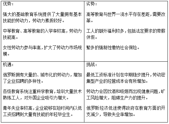 对于雇用者而言,俄罗斯尽管有数量巨大的可用劳动力,但是劳动力市场存在着显著风险。20世纪90年代,俄罗斯极低的出生率和较高的死亡率导致劳动力数量减少,使得企业招聘劳动力的选择余地有限。俄罗斯民众健康状况不佳,引发长期旷工和生产力低下等风险。尽管俄罗斯有大量的移民工人,但是来自发达国家的移民较少,难以吸引到高技能外国工人,这对于那些需要低技能、低工资雇工的公司比较有利。